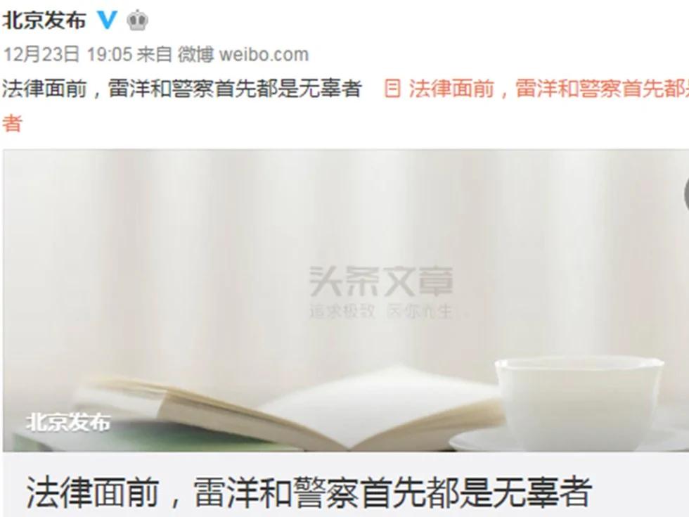 北京时间12月23日晚,北京市政府新闻办公室官方微博“北京发布”贴出头条文章《法律面前,雷洋和警察首先都是无辜者》。文章承认,北京检方对雷洋案涉案警务人员作出不起诉处理,“无奈者有之,质疑者有之,攻击者有之。”